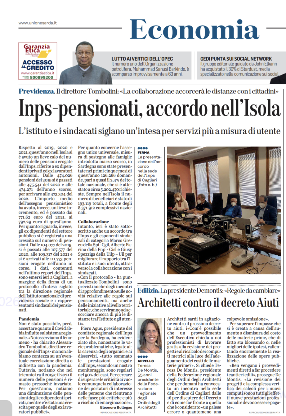 Nella giornata di ieri è stato firmato uno storico accordo per migliorare i servizi inps e renderli sempre più a misura di utente. Firmatari dell'accordo Alberto Farina, Segretario Generale FNP CISL Sardegna, Giusy Spezzigu per UILP UIL, Marco Grecu per SPI CGIL e Alessandro Tombolini dell'INPS. È intervenuto anche Piero Agus il Presidente del Comitato regionale INPS. In allegato gli articoli sui principali quotidiani dell'isola. "Il protocollo nasce a seguito di una esigenza posta diverse volte dalle nostre Federazioni dei pensionati all'Istituto stesso e finalmente accolta. Dal periodo pandemico in poi i nostri iscritti hanno avuto sempre più difficoltà a dialogare con l'INPS. Da adesso in poi questo protocollo permetterà alle nostre Segreterie regionali e territoriali di poter direttamente chiedere un incontro alle Direzioni regionali e provinciali per affrontare i problemi che si creano sul territorio in relazione ai pensionati. Una sorta di canale preferenziale per portare avanti le esigenze dei nostri iscritti" ha commentato Alberto Farina al termine della riunione.