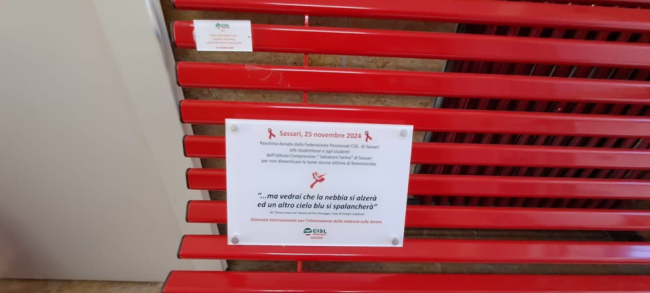 Una mattinata di riflessione nell’istituto comprensivo Salvatore Farina per studenti e studentesse della Terza media: in occasione della Giornata Internazionale contro la violenza sulle donne, la Federazione Pensionati Cisl Sassari ha donato alla scuola una panchina rossa. All’evento, promosso in collaborazione con il dirigente scolastico Luciano Sanna, hanno partecipato il sostituto procuratore Angelo Beccu, la segretaria generale dei Pensionati Fnp Cisl di Sassari, Vannalisa Manca, la Coordinatrice Donne Fnp, Cristina Rebeccu, i segretari Anna Maria Cadeddu e Massimo Pinna, insieme ai segretari della Cisl, Sergio Mura, Alessandro Marcellino e Maria Giovanna Mela